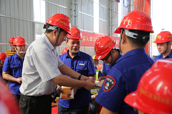 王躍飛給現(xiàn)場員工贈送黨的十九大報告有關(guān)書籍?