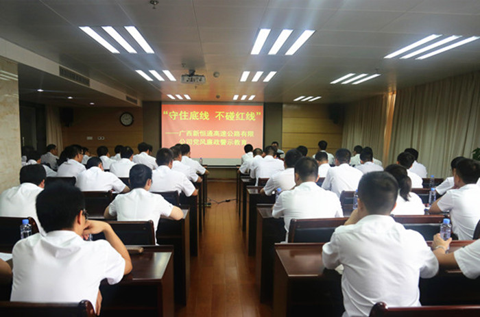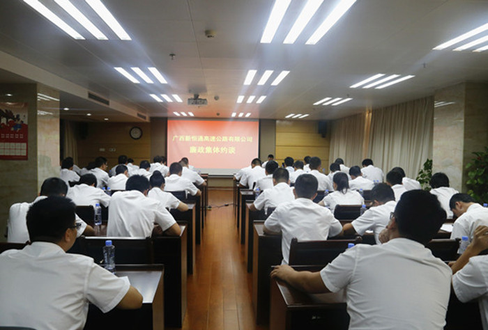 活動上,新恒通公司黨委書記、董事長賴水平還對與會人員進行了廉政集體約談。賴水平感謝吳雄飛老師給大家上了一堂別開生面的廉政警示教育課,作為交通基礎設施建設行業的業主單位,在廉潔從業的道路上,他提出幾點要求和期望:一是加強學習,提升道德修養,堅定理想信念;二是嚴于律己,規范作風行為,筑牢防腐堤壩;三是嚴以用權,增強廉政意識,緊守從業底線;四是守土有責,堅持“一崗雙責”,深化責任落實。賴水平強調,廣西交通基礎設施建設正處于大有可為、大有作為的歷史機遇期,面對紛繁復雜的形勢,全體黨員干部要在黨的十九大精神的指引下,緊緊圍繞公司總體工作思路和目標,統一思想,堅定信念,持續加強作風建設,堅決把紀律挺在前面,耳邊常響廉潔警鐘,心中常筑反腐防線,用廉潔從業的實際行動為公司“縣縣通”高速公路建設事業的發展保駕護航。
