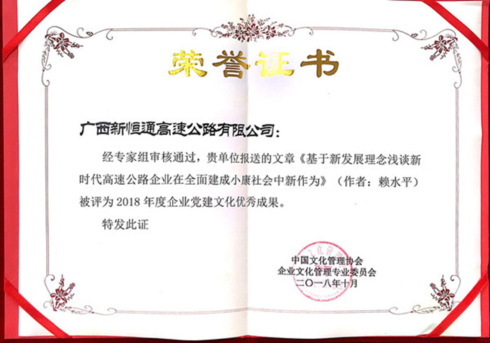 會上,由賴水平撰寫的文章《基于新發(fā)展理念淺談新時代高速公路企業(yè)在全面建成小康社會中新作為》在企業(yè)黨建文化優(yōu)秀成果評比中,被評為2018年度企業(yè)黨建文化優(yōu)秀成果;由新恒通公司都巴指揮部創(chuàng)作團(tuán)隊(duì)拍攝的《遷動人心》微電影榮獲“最美企業(yè)之聲”代言作品榮譽(yù)稱號。